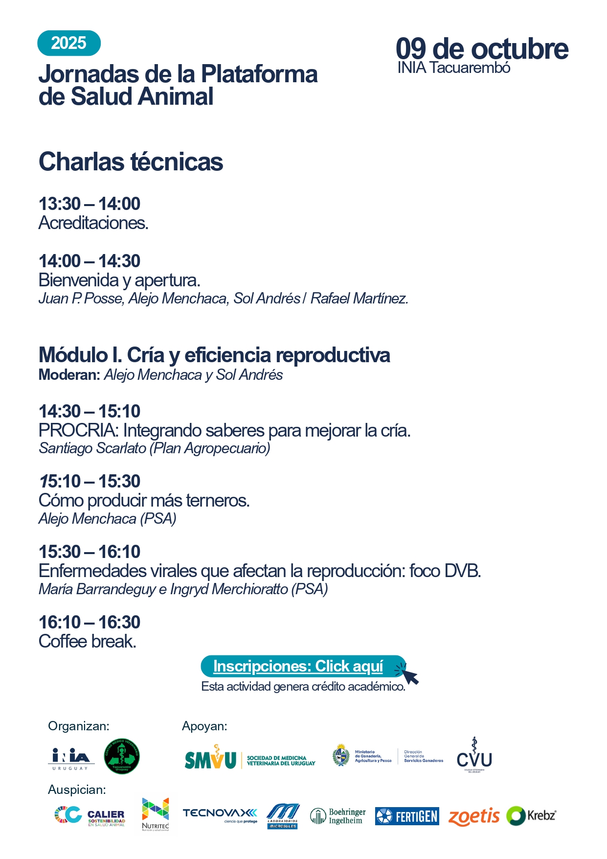 Con el fin de intercambiar conocimiento y perspectivas en torno a los avances del proyecto Procría, las enfermedades reproductivas y el control de la garrapata, el Instituto Nacional de Investigación Agropecuaria (INIA) y el Centro Médico Veterinario de Tacuarembó realizarán una actividad abierta a todo público el próximo jueves 9 de octubre en INIA Tacuarembó.
