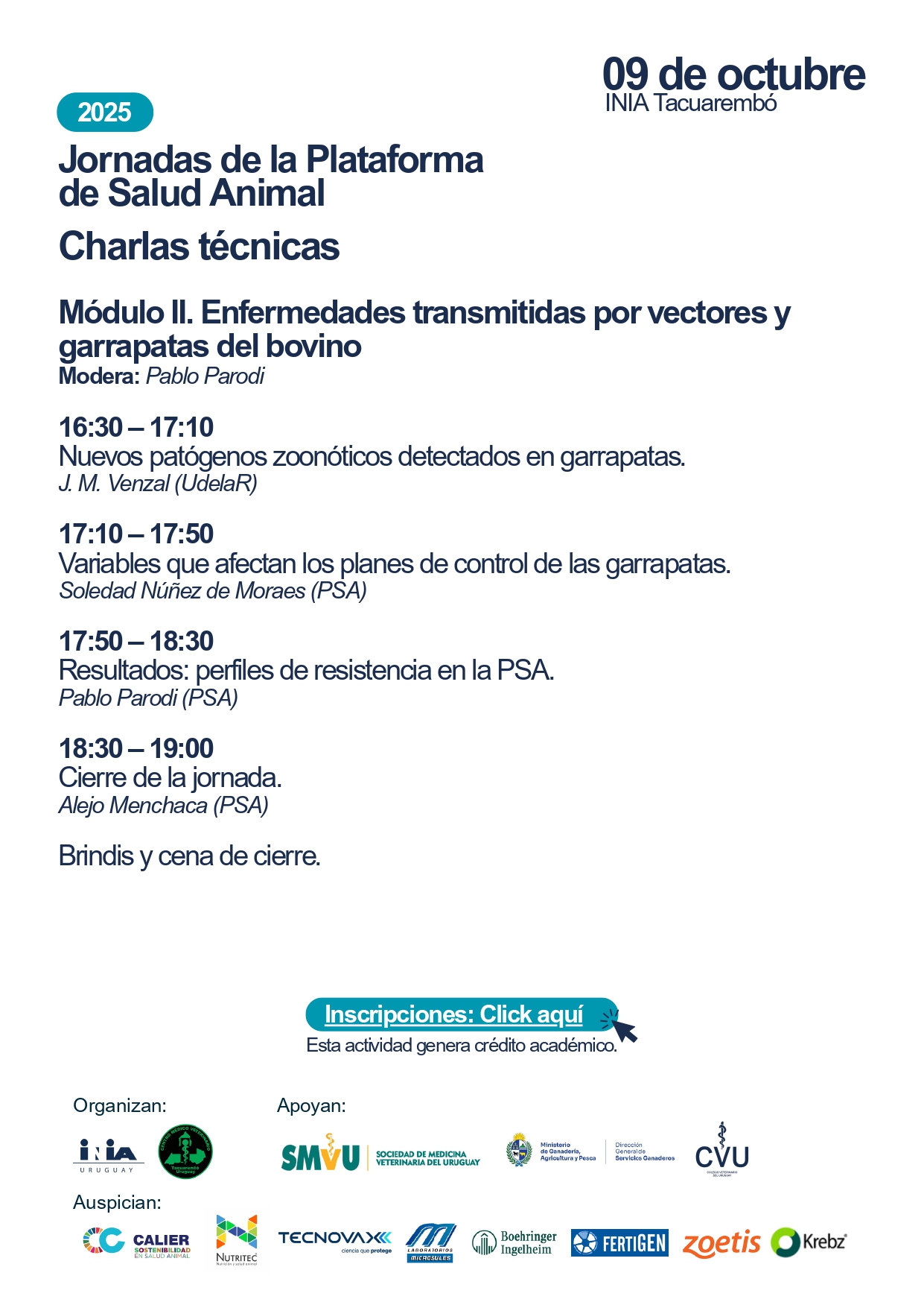 El segundo bloque comenzará con la presentación del Dr. José Manuel Venzal (Universidad de la República), quien pondrá foco en investigaciones recientes que detectaron nuevas enfermedades trasmitidas por las garrapatas. Le seguirá la Dra. Soledad Núñez (INIA), quien compartirá algunos factores que inciden positiva y negativamente en las campañas sanitarias contra la garrapata, y resultados de una encuesta realizada en la materia.
